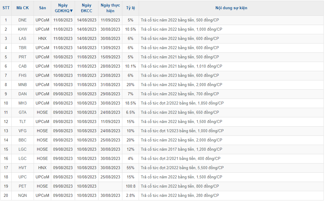 Tuần từ 7/8- 12/8, trên thị trường chứng khoán Việt Nam có 28 doanh nghiệp chốt quyền nhận cổ tức bằng tiền mặt. Trong số đó doanh nghiệp trả cổ tức tỷ lệ cao như CTCP Hóa chất Việt Trì (Mã: HVT) trả tỷ lệ 55%.
