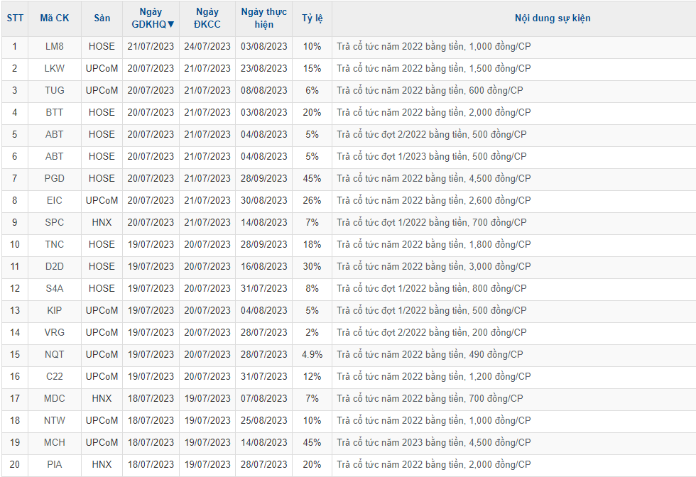Tuần từ 17/7- 21/7, trên thị trường chứng khoán Việt Nam có 29 doanh nghiệp chốt quyền nhận cổ tức bằng tiền mặt. Trong số đó doanh nghiệp trả cổ tức tỷ lệ cao như Công ty Cổ phần Hàng tiêu dùng Masan (MCH) và CTCP Phân phối khí thấp áp Dầu khí Việt Nam (PGD) trả tỷ lệ 45%.