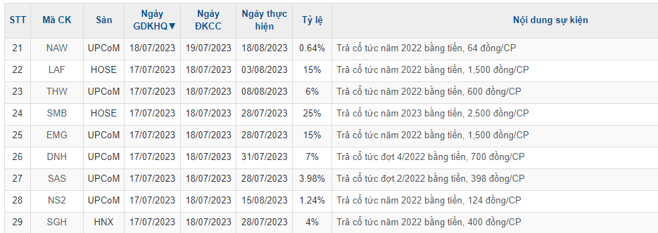 Theo thống kê trong tuần 17/7 – 21/7 có 29 doanh nghiệp thông báo chốt quyền cổ tức bằng tiền mặt. Trong số các doanh nghiệp chia cổ tức tiền mặt tuần này, cao nhất là 45% và thấp nhất là 1%.
