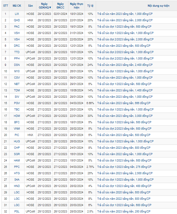 CTCP Thuỷ Điện Vĩnh Sơn - Sông Hinh (Mã VSH): Ngày 29/12/2023 là ngày đăng ký cuối cùng để chốt danh sách nhận cổ tức bằng tiền đợt 1 năm 2023 tỷ lệ 30% (1 cổ phiếu được nhận 3.000 đồng). Ngày thanh toán đợt 1 tỷ lệ 10% ngày 31/1/2024; đợt 2 tỷ lệ 20% ngày 22/3/2024.