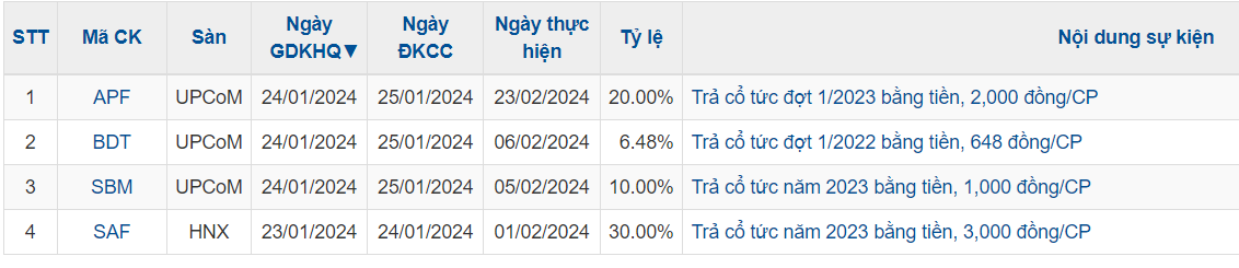 Tuần từ 22-26/1, trên thị trường chứng khoán Việt Nam có 4 doanh nghiệp chốt quyền nhận cổ tức bằng tiền mặt. Trong số đó doanh nghiệp trả cổ tức tỷ lệ cao như CTCP Lương thực Thực phẩm Safoco (mã SAF) trả tỷ lệ 30%.