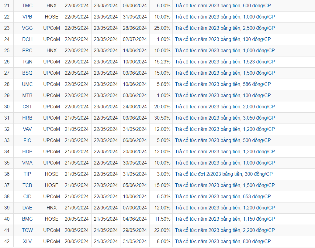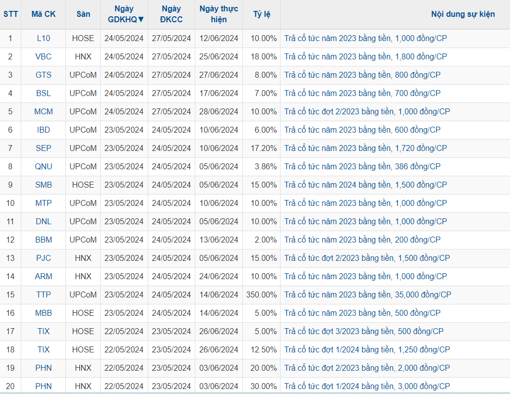 Tuần từ 20/5 - 26/5, trên thị trường chứng khoán Việt Nam có 42 doanh nghiệp chốt quyền nhận cổ tức bằng tiền mặt. Trong số đó doanh nghiệp trả cổ tức tỷ lệ cao như CTCP Bao bì Nhựa Tân Tiến (mã TTP) trả tỷ lệ 350%.