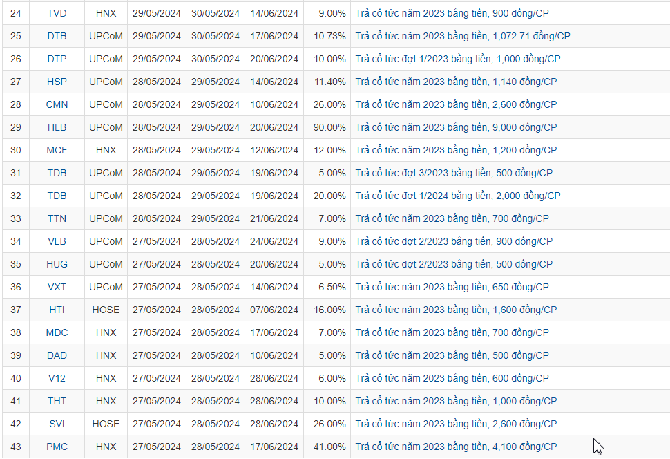 Theo thống kê trên 3 sàn HoSE, HNX và UPCoM, có 43 doanh nghiệp chốt trả cổ tức cho cổ đông, các ngày trong tuần từ 27 đến 31/5.