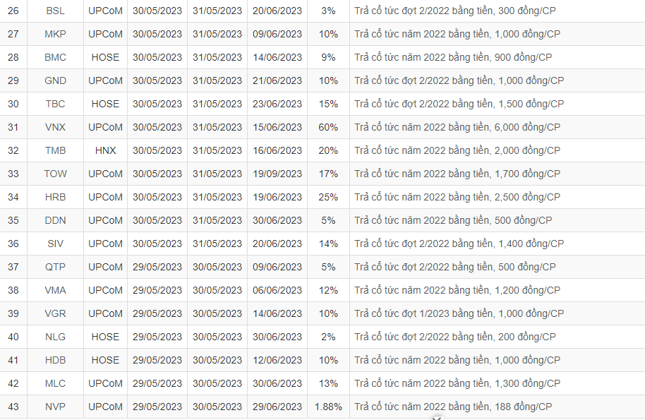 CTCP Harec Đầu tư và Thương Mại (Mã HRB): Ngày 31/5/2023 là ngày đăng ký cuối cùng để chốt danh sách nhận cổ tức bằng tiền năm 2022 tỷ lệ 25% (1 cổ phiếu được nhận 2.500 đồng). Ngày thanh toán là 19/6/2023.