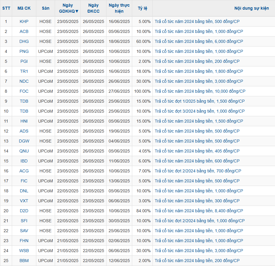 Theo thống kê, có 50 doanh nghiệp thông báo chốt quyền cổ tức bằng tiền mặt trong tuần 19/5-24/5 với mức cao nhất là 100% và thấp nhất là 1%.