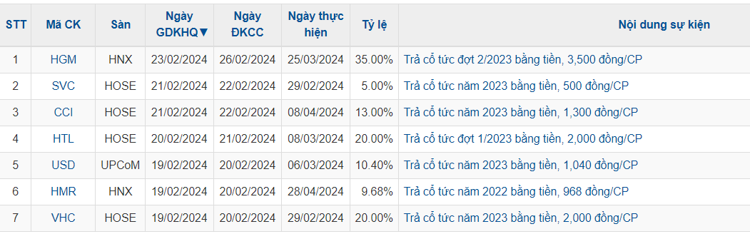Tuần từ 19/2-23/2, trên thị trường chứng khoán Việt Nam có 24 doanh nghiệp chốt quyền nhận cổ tức bằng tiền mặt. Trong số đó doanh nghiệp trả cổ tức tỷ lệ cao như CTCP Cơ khí và Khoáng sản Hà Giang (Mã: HGM) trả tỷ lệ 35%.