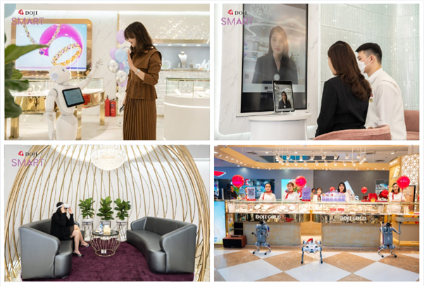 Chuỗi trung tâm DOJI Smart tại Hà Nội và Đà Nẵng là điểm nhấn trong hệ thống DOJI, nổi bật với ứng dụng công nghệ thực tế ảo và trí tuệ nhân tạo trong mua sắm trang sức. Khách hàng có thể trải nghiệm thử trang sức thông minh, chọn trang sức từ e-catalog và được hỗ trợ từ robot Pepper... Mới đây, DOJI cũng gây ấn tượng với loạt hoạt động tiếp thị cùng robot Puppy tại các trung tâm thương mại, thu hút sự quan tâm của đông đảo khách hàng.