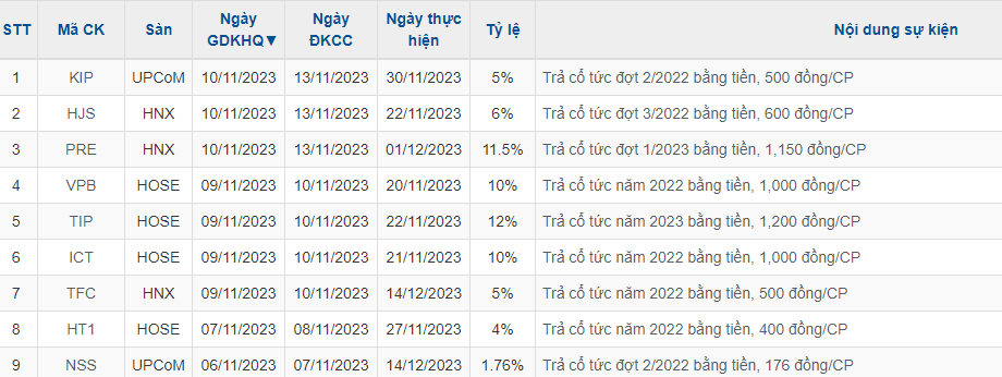 Ngày 22/11/2023, CTCP Phát triển Khu Công nghiệp Tín Nghĩa (HOSE: TIP) trả cổ tức năm 2023 bằng tiền, 1.200 đồng/CP, ngày giao dịch không hưởng quyền là 9/11 và ngày đăng ký cuối cùng là 10/11.