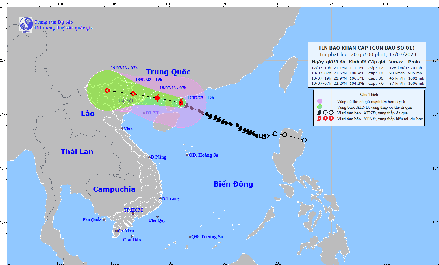 Hồi 19h ngày 17/7, vị trí tâm bão ở cách Móng Cái (Quảng Ninh) khoảng 330km về phía đông đông nam. Sức gió mạnh nhất vùng gần tâm bão mạnh cấp 12, giật cấp 15. Ảnh: NCHMF