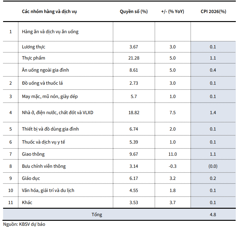 Trong kịch bản cơ sở, KBSV ước tính nhóm nhà ở, điện nước, chất đốt và vật liệu xây dựng có thể tăng khoảng 7,5% YoY trong năm 2026, qua đó đóng góp khoảng 1,4 điểm phần trăm vào CPI chung.
