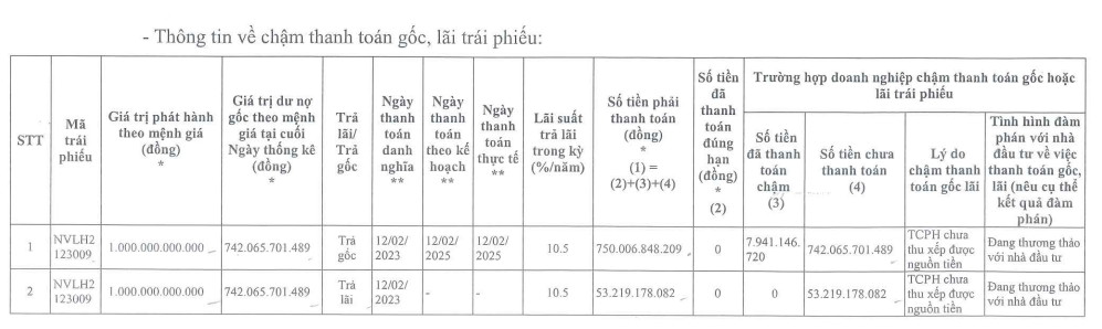 Theo kế hoạch, ngày 12/2/2025, Novaland sẽ phải thanh toán gốc và lãi cho lô trái phiếu mã NVLH2123009 với tổng số tiền hơn 802,2 tỷ đồng. Trong đó, có hơn 750 tỷ đồng tiền gốc và hơn 53,2 tỷ đồng tiền lãi trái phiếu. Tuy nhiên, Novaland mới chỉ thanh toán được hơn 7,9 tỷ đồng tiền gốc trái phiếu.