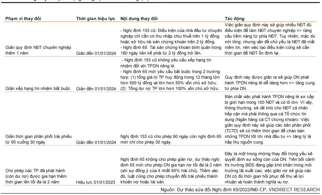 Trong báo cáo thị trường trái phiếu năm 2022 triển vọng 2023 mới cập nhật, Công ty Chứng khoán VnDirect nhận định thị trường trái phiếu doanh nghiệp Việt Nam bùng nổ trong giai đoạn 2020-21, tuy nhiên những rủi ro đầu tư đã bộc lộ qua một số sai phạm xảy ra đầu năm 2022. Điều này khiến nhà đầu tư suy giảm niềm tin vào kênh dẫn vốn quan trọng này. Nghị định 65, có hiệu lực từ ngày 16/9/2022, đặt ra các điều kiện và yêu cầu nghiêm ngặt hơn đối với việc phát hành trái phiếu riêng lẻ.