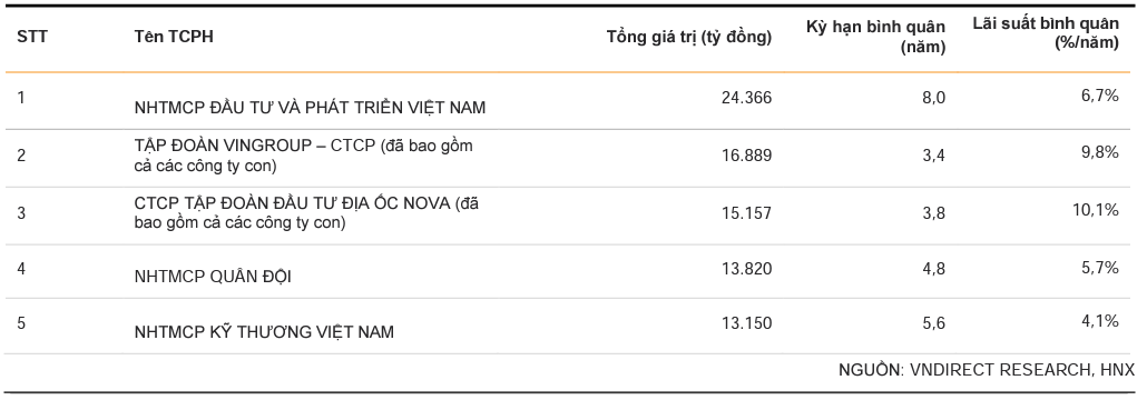 Top 5 các doanh nghiệp phát hành trái phiếu nhiều nhất gồm có: NHTMCP Đầu tư và Phát triển Việt Nam (24.366 tỷ đồng), Tập đoàn Vingroup và các công ty con (16.569 tỷ đồng); Tập đoàn Địa ốc NOVA và các công ty con (15.157 tỷ đồng), NHTMCP Quân Đội (13.820 tỷ đồng), NHTMCP Kỹ Thương Việt Nam (13.150 tỷ đồng).