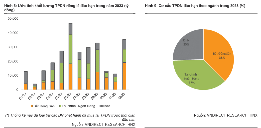 Thị trường trái phiếu doanh nghiệp đóng vai trò quan trọng trong việc dẫn vốn dài hạn vào nền kinh tế. Mặc dù vậy, với sự bùng nổ phát hành trái phiếu trong giai đoạn 2019 – 2021, tổng giá trị trái phiếu riêng lẻ đáo hạn năm 2023 ước tính khoảng 272.853 tỷ đồng (+76,6% so với cùng kỳ). Trong đó Bất động sản và Tài chính - Ngân hàng lần lượt chiếm 38% và 37%.