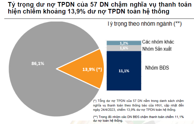 Ước tính tổng dư nợ TPDN của các doanh nghiệp này vào khoảng 152,7 nghìn tỷ đồng chiếm khoảng 13,9% dư nợ TPDN riêng lẻ toàn thị trường. Khoảng hơn 45,2 nghìn tỷ đồng TPDN của các DN trong danh sách sẽ đáo hạn trong năm 2023 chiếm khoảng 19,4% tổng giá trị đáo hạn toàn thị trường cả năm. Trong đó, nhóm các doanh nghiệp Bất động sản chậm thanh toán chiếm 11,1% dư nợ toàn hệ thống.