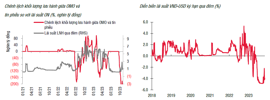 Chênh lệch giữa lãi suất VND-USD kỳ hạn qua đêm qua về mức âm 400 điểm cơ bản và áp lực phát hành tín phiếu với khối lượng lớn hơn từ NHNN sẽ cao hơn khi trong tuần này sẽ ghi nhận thêm 65 nghìn tỷ đồng tín phiếu đáo hạn.