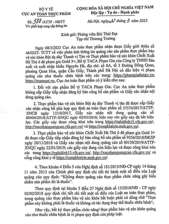 Sau đó, Cục An toàn thực phẩm đã có văn bản trả lời Tạp chí Thương Trường về những nội dung mà Tạp chí phản ánh.