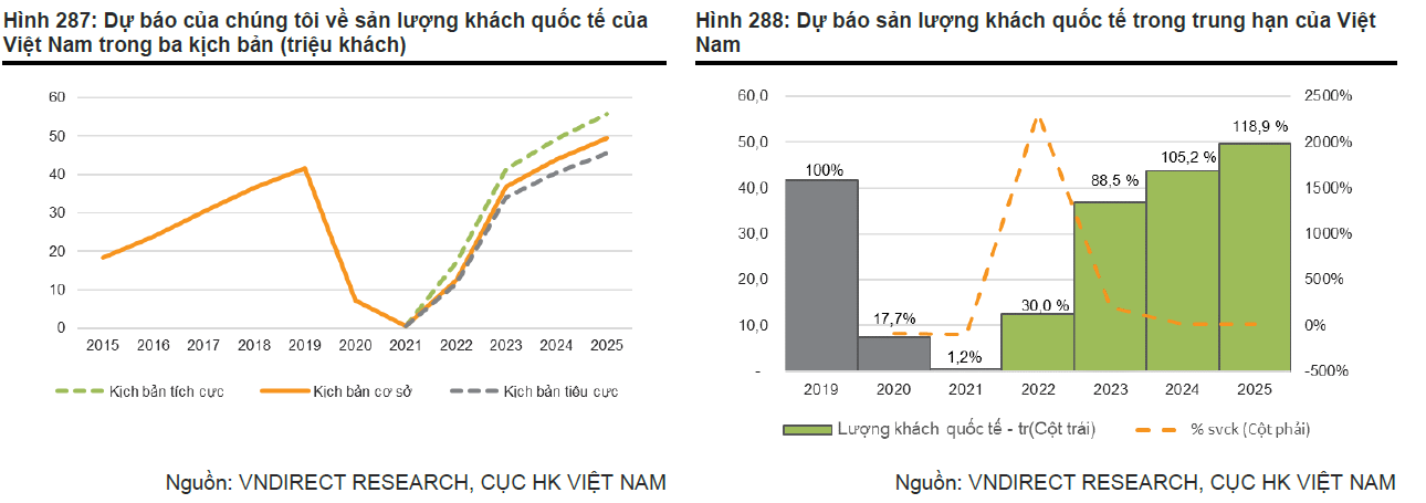 Trong kịch bản cơ sở của VNDirect, đường bay giữa Việt Nam và Đông Nam Á sẽ phục hồi mạnh mẽ từ quý 3/2022 do xúc tiến du lịch đã được triển khai, tiếp theo là Hàn Quốc, Châu Âu, Nhật Bản, Hoa Kỳ và Ấn Độ trong quý 4/2022. Quảng bá du lịch Đài Loan và Nga có thể được thực hiện trong quý 1/2023, trong khi quảng bá du lịch Trung Quốc có thể được thực hiện trong quý 3/2023. Do đó, tổng lượng khách quốc tế từ thị trường Đông Nam Á có thể phục hồi trở lại mức trước đại dịch trong quý 1/2023, tiếp theo là Hàn Quốc, Châu Âu, Nhật Bản, Hoa Kỳ trong quý 2/2023, Đài Loan và Nga trong quý 3/2023 và Trung Quốc trong quý 1/2024.