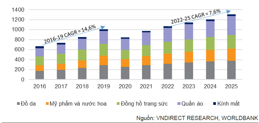 Theo Statista, doanh thu các mặt hàng xa xỉ của Việt Nam trong giai đoạn 2016-19 đã tăng trưởng kép 14,6% và có thể tăng trưởng với tốc độ tăng trưởng kép 7,6% trong giai đoạn 2022-25 từ mức nền cao trong năm 2021. Đây là yếu tố ủng hộ mạnh mẽ cho triển vọng mảng bán lẻ miễn thuế Việt Nam trong những năm tới.