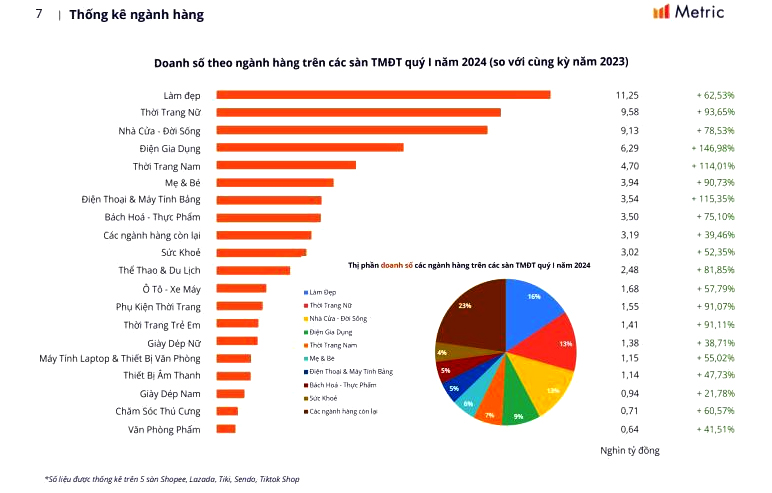 Sở dĩ lĩnh vực Làm đẹp có thể duy trì được vị thế liên tục như vậy, theo ông Phạm Bảo Trung - Giám đốc kinh doanh Metric, Làm đẹp là nhóm hàng hoá sản phẩm có sức mua lại cao, nhiều chương trình khuyến mại so với cửa hàng offline, khách hàng phần nhiều là nữ, và tệp khách hàng chủ yếu của các sàn thương mại điện tử. Trong đó, sản phẩm chăm sóc da mặt là nhóm sản phẩm phổ biến nhất với doanh số 3223 tỷ đồng, và có 22,32 triệu sản phẩm được bán ra.