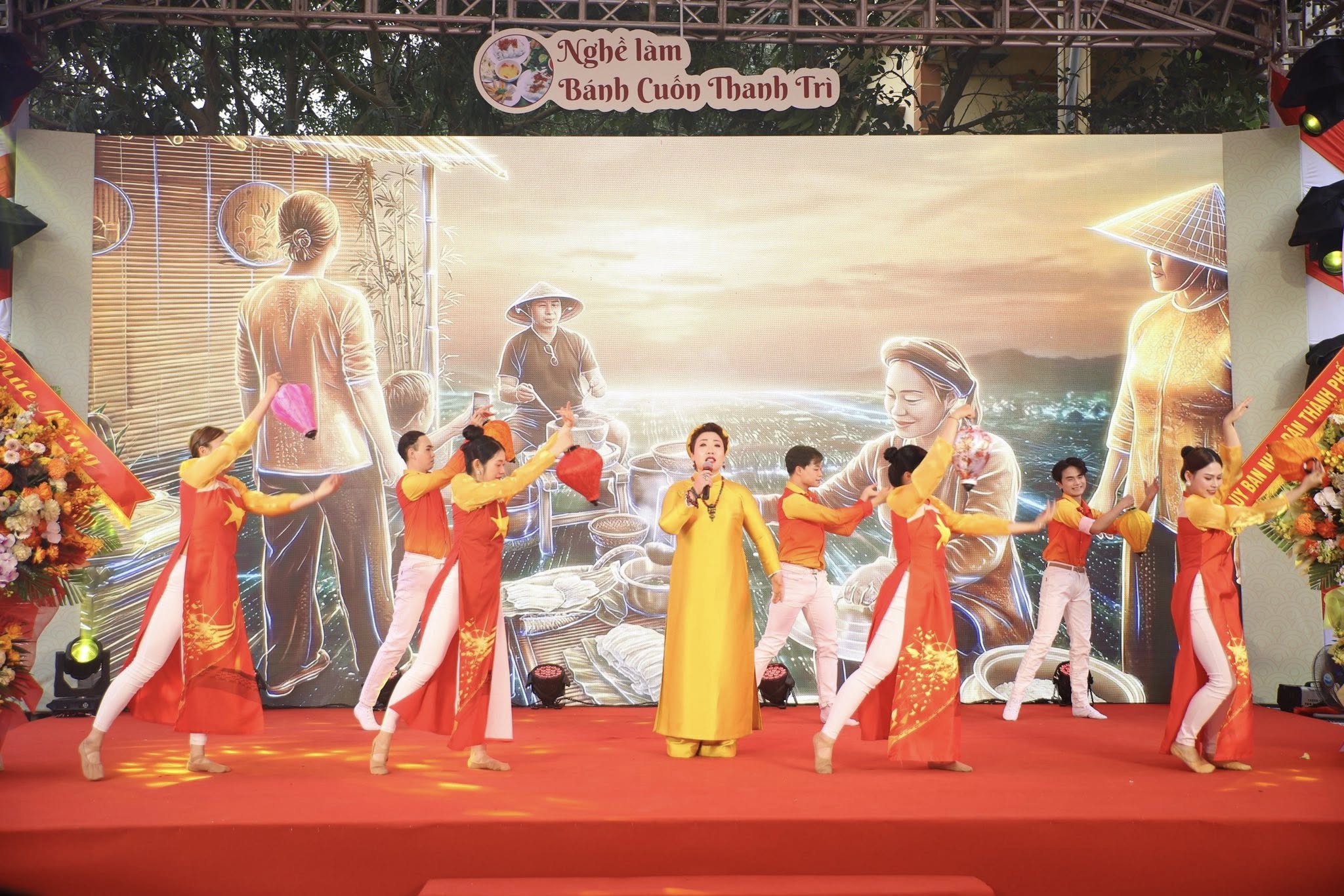 Tiết mục nghệ thuật chào mừng Lễ công bố Quyết định ghi danh nghề làm bánh cuốn Thanh Trì vào Danh mục Di sản văn hóa phi vật thể quốc gia. Ảnh: Việt Hùng