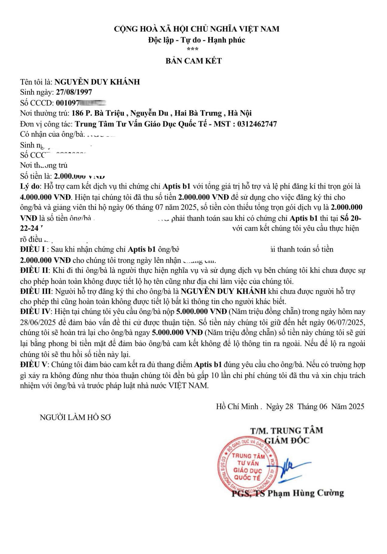 Bản cam kết thi hộ chứng chỉ anh H đã thực hiện với phía trung tâm.