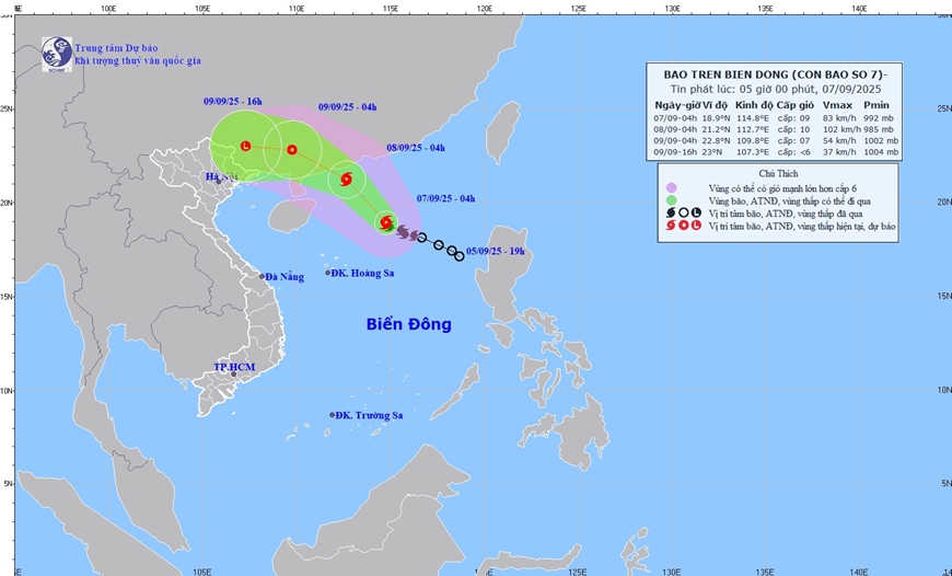 Trung tâm Dự báo Khí tượng thủy văn quốc gia cho biết, hồi 4 giờ ngày 7/9, tâm bão số 7 (Tapah) ở trên vùng biển phía Bắc Biển Đông. Sức gió mạnh nhất vùng gần tâm bão cấp 8–9 (62–88km/giờ), giật cấp 11. Di chuyển theo hướng Tây Tây Bắc, tốc độ 10km/giờ.