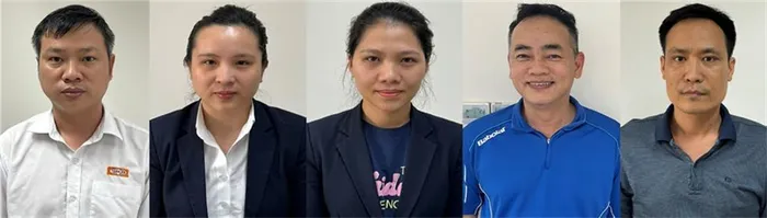 Các bị can (từ trái qua phải): Hoàng Liên Sơn; Võ Thị Thùy Trang; Trần Thị Minh Trang; Nguyễn Hoàng Vũ; Phan Thanh Thuận.