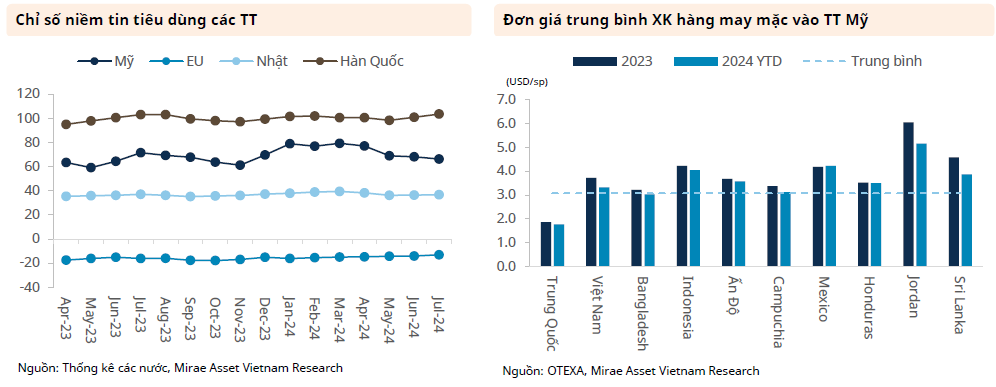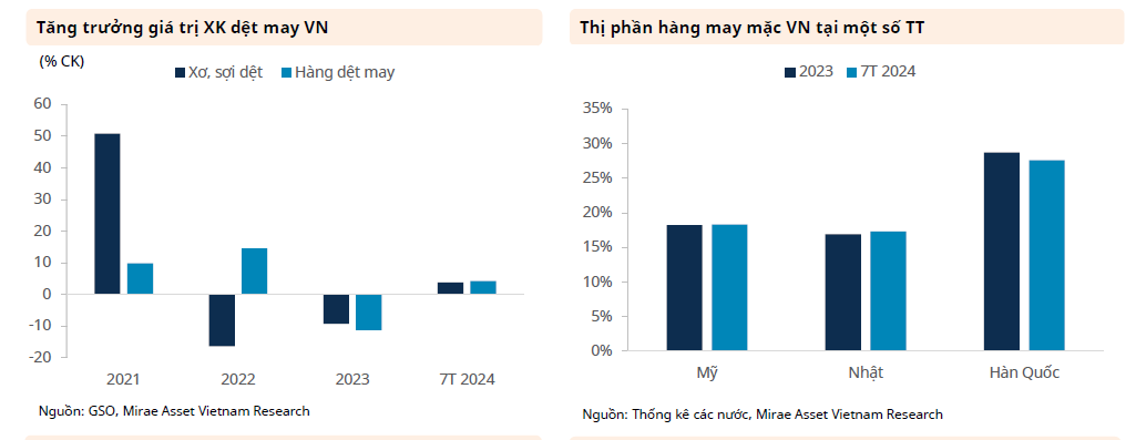 Báo cáo phân tích mới đây của Chứng khoán Mirae Asset Việt Nam (MASVN) cho biết ngành dệt may Việt Nam tiếp tục duy trì tăng trưởng xuất khẩu trong 7 tháng đầu năm 2024, mặc dù đà tăng đã chậm lại trong quý 2. Xuất khẩu sợi và sản phẩm dệt may ước đạt lần lượt 2.5 tỷ USD (+3.7% cùng kỳ) và 19.8 USD (+4.2% cùng kỳ).