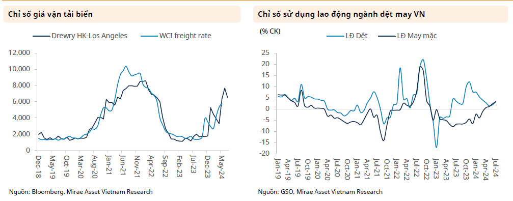Sản xuất dệt may trong nước tiếp tục cải thiện trong 7 tháng. IIP mảng dệt và may mặc tăng lần lượt 12.4% cùng kỳ và 6.2% cùng kỳ. Ngoài ra, hệ số sử dụng lao động trong ngành dệt tiếp tục tăng trưởng, trong khi hệ số này ở mảng may mặc cũng cải thiện.