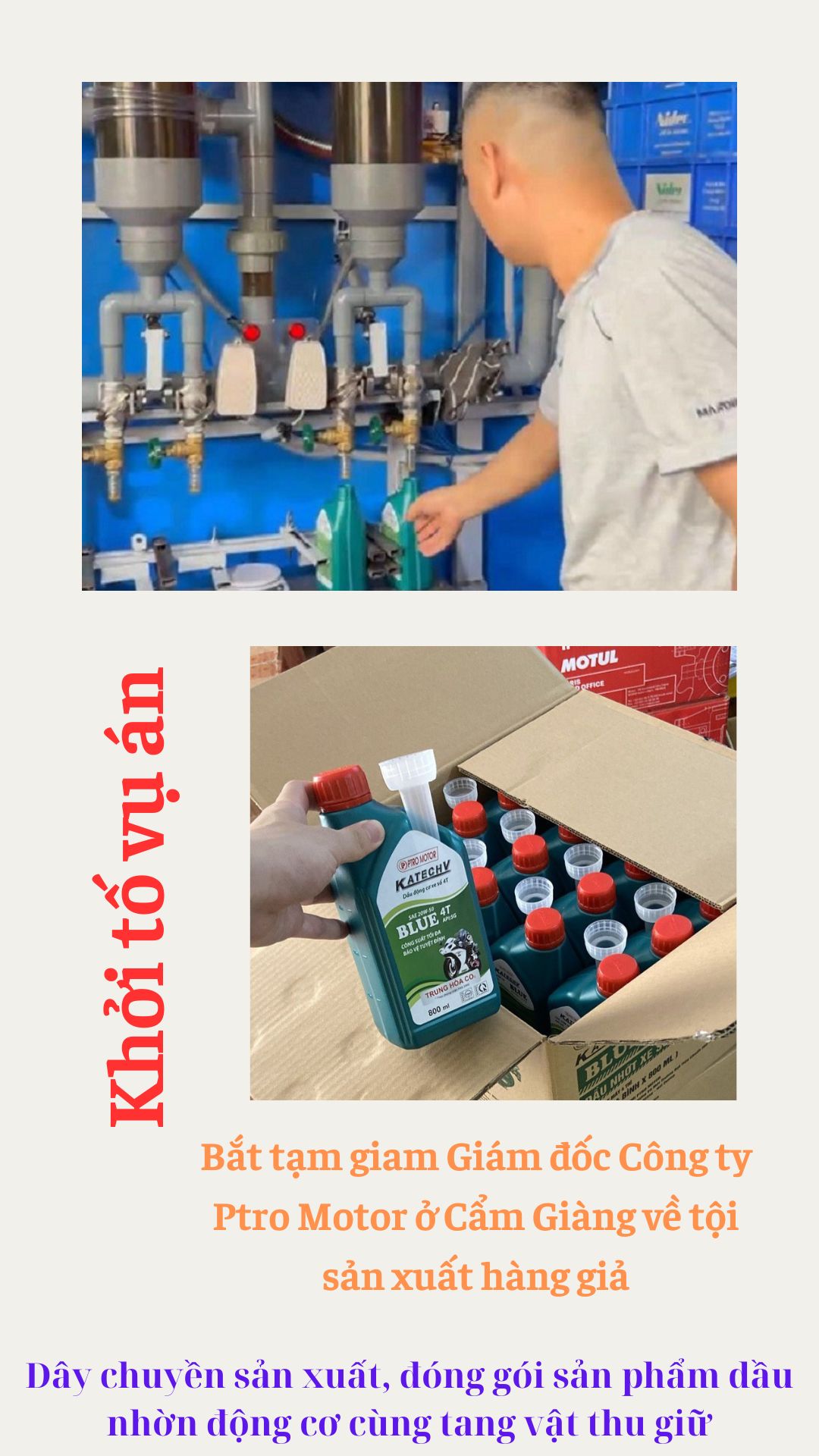 Kiểm tra tại địa điểm sản xuất, nhà kho và nhà riêng của Nguyễn Văn Phương, cảnh sát phát hiện, thu giữ 1.478 chai dầu nhờn động cơ đốt trong 4T SAE 20W-50 API:SG thương hiệu KATECHV của Công ty TNHH Ptro Motor nghi là hàng giả.