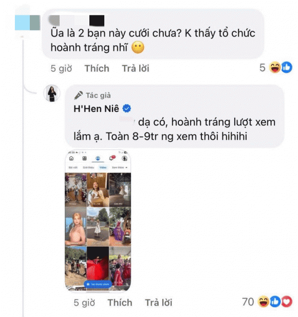H’Hen Niê khéo đáp trả vừa hài hước vừa tinh tế: "Dạ có, hoành tráng lượt xem lắm ạ. Toàn 8 - 9 triệu người xem thôi hihi", kèm theo ảnh chụp màn hình loạt video về đám cưới của người đẹp nay đã đạt triệu view trên Facebook.