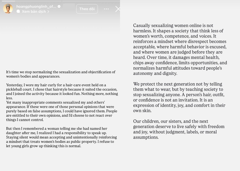 Mới đây nhất, Hoa hậu Phương Linh chính thức lên tiếng trên trang cá nhân. Người đẹp chia sẻ dòng trạng thái khá dài bằng tiếng Anh, cho biết cảm thấy phẫn nộ khi vẻ ngoài của mình bị đem ra soi mói, phán xét trên mạng.