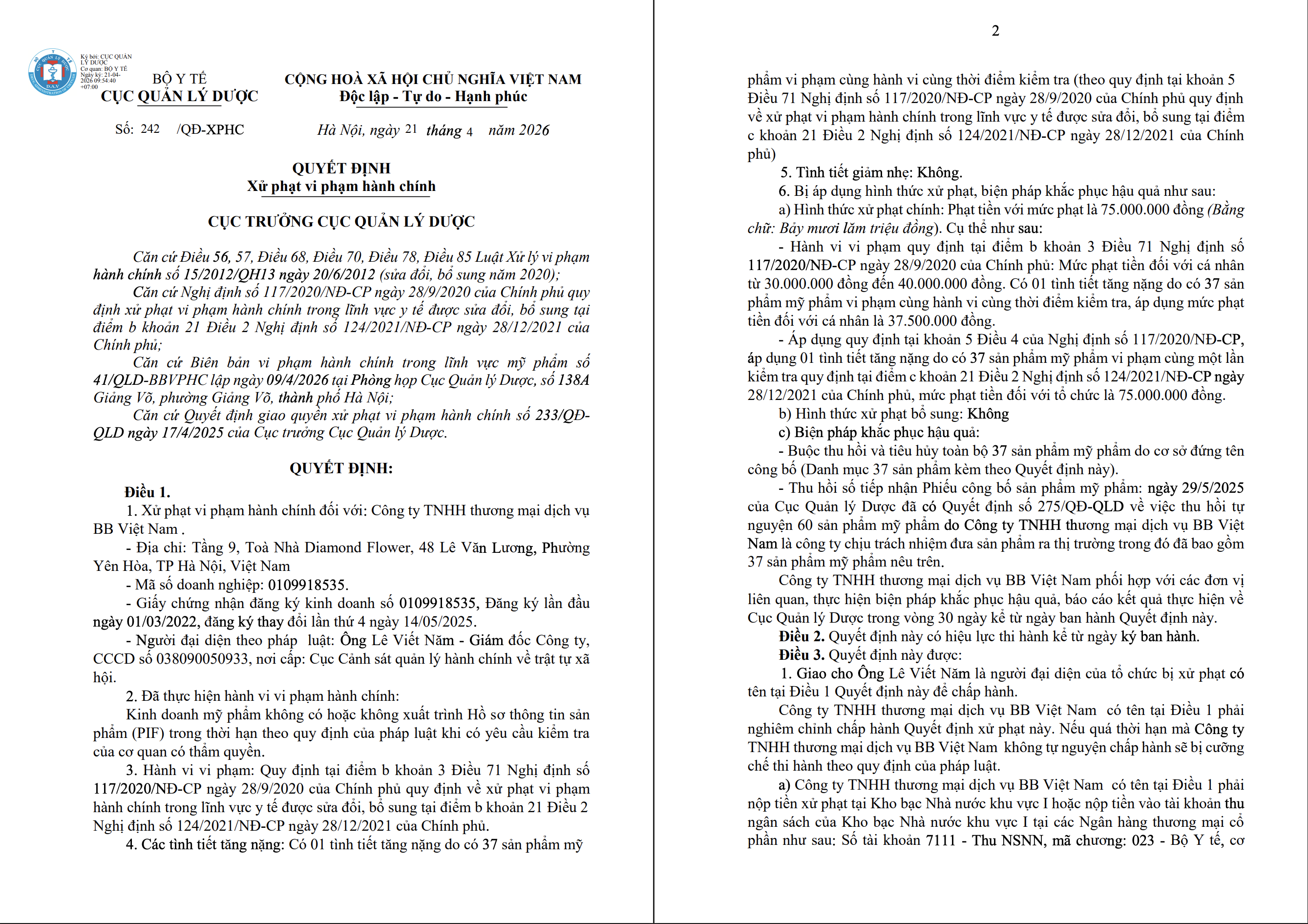 Theo quyết định, Công ty TNHH Thương mại dịch vụ BB Việt Nam, có trụ sở tại Tầng 9, Tòa nhà Diamond Flower, 48 Lê Văn Lương, phường Yên Hòa, TP Hà Nội, đã thực hiện hành vi kinh doanh mỹ phẩm nhưng không có hoặc không xuất trình được Hồ sơ thông tin sản phẩm (PIF) theo quy định khi cơ quan chức năng yêu cầu kiểm tra. Hành vi này vi phạm quy định tại Nghị định số 117/2020/NĐ-CP của Chính phủ về xử phạt vi phạm hành chính trong lĩnh vực y tế .