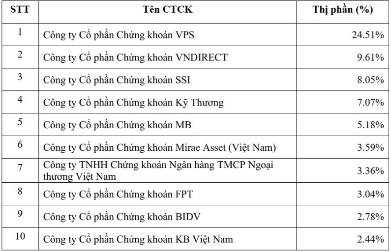 SSI trụ vững ở vị trí thứ 2 với thị phần đạt 10,59%. Thị phần VNDIRECT giảm về 7,21% (so mức 7,27% của quý 2). Chứng khoán Kỹ Thương (TCBS) cải thiện mạnh thị phần từ mức 5,47% của quý 2 lên 6,8% trong quý 3.