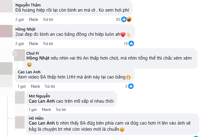 Dưới phần bình luận, netizen để lại thắc mắc: "Tuyệt đối điện ảnh, đã Hoàng Hiệp rồi lại còn Bình An", "Đồng chí Bình An cao bằng đồng chí Hiệp luôn á?", "Nếu nhìn vai thì An thấp hơn chút, mà nhìn tổng thể thì chắc xêm xêm",...