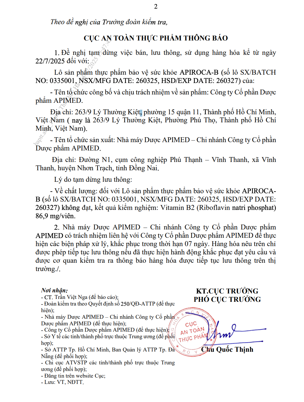 Sản phẩm bị đình chỉ là viên nén sủi APIROCA-B, thuộc lô sản xuất 0335001, ngày sản xuất 26/3/2025 và hạn sử dụng đến 26/3/2027. Đây là sản phẩm do Công ty Cổ phần Dược phẩm APIMED công bố và chịu trách nhiệm (địa chỉ: 263/9 Lý Thường Kiệt, phường Phú Thọ, quận 11, TP.HCM), sản xuất tại Nhà máy Dược APIMED – Chi nhánh tại Đồng Nai (đường N1, Cụm công nghiệp Phú Thạnh – Vĩnh Thanh, xã Vĩnh Thanh, huyện Nhơn Trạch).