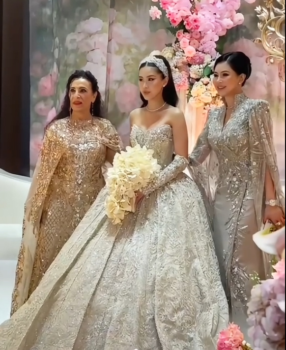 Ngoài quan tâm đến cô dâu, chú rể, một nhân vật khác cũng hot không kém chính là bà Lê Hồng Thủy Tiên - mẹ ruột Tiên Nguyễn. Trong ngày trọng đại của con gái, bà chọn một thiết kế Haute Couture đến từ nhà mốt Lebanon – Ziad Nakad.
