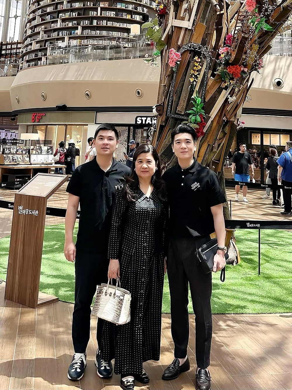 Quý bà 6X chọn túi Saint Laurent họa tiết da cá sấu giá gần 80 triệu đồng khi chụp hình cùng con trai lớn.
