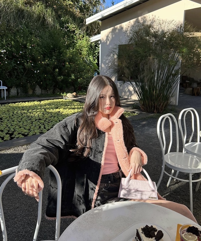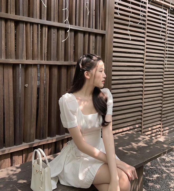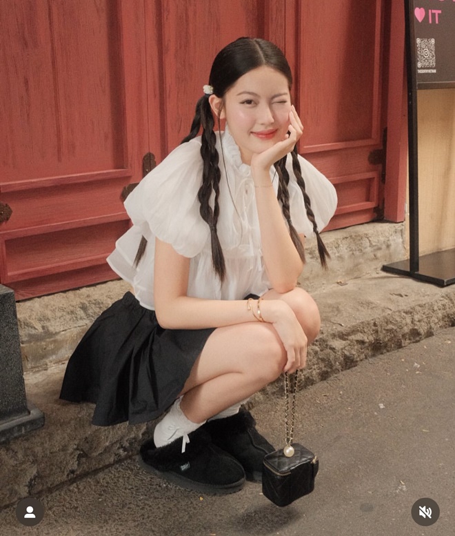 Phong cách thời trang mang đậm tinh thần "preppy" pha chút Lolita hiện đại, tạo nên tổng thể trẻ trung, tinh nghịch nhưng vẫn giữ được nét duyên dáng và chỉn chu cho người đẹp. Chiếc túi mini dáng hộp đen với dây xích ánh kim và chi tiết ngọc trai nhỏ từ nhà mốt Chanel góp phần tô điểm cho outfit thêm sang xịn.