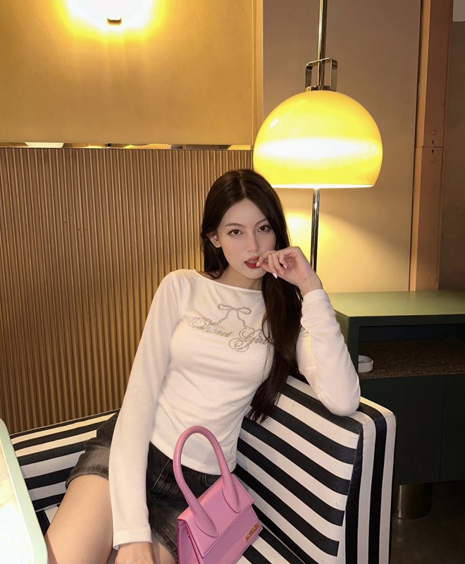 Diện áo thun tay dài và chân váy denim năng động, Tăng Mỹ Hàn khéo léo phối thêm phụ kiện túi xách Jacquemus tông hồng ngọt ngào giúp ''trẻ hóa'' phong cách.