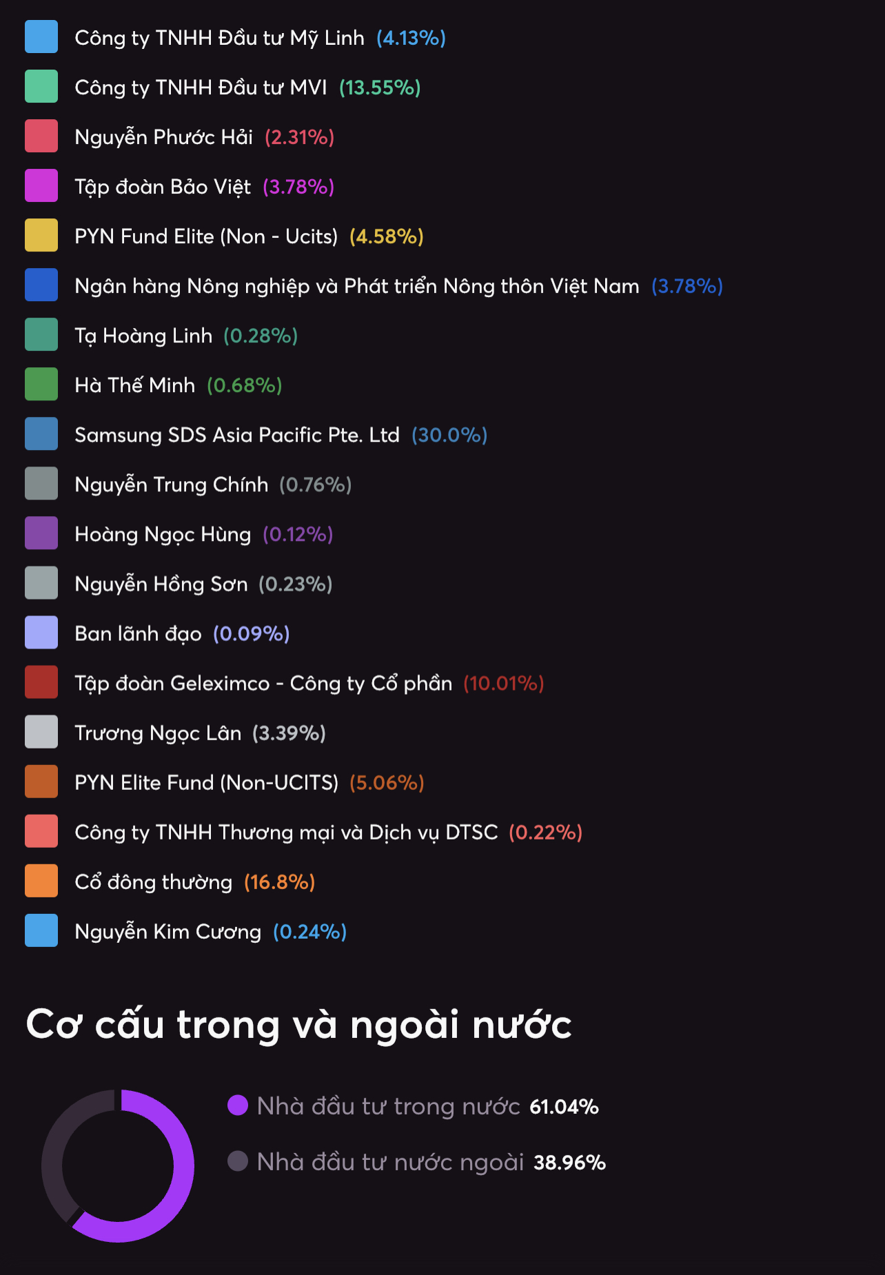 BCTC hợp nhất của Tập đoàn CMC tại ngày 30/9 cho thấy. Cơ cấu cổ đông gồm: Sasmung SDS Asia Pacific Pte Ltd nắm 30% cổ phần. Công ty TNHH Đầu tư MVI nắm 13% cổ phần. CTCP Xuất nhập khẩu Tổng hợp Hà Nội nắm (Geleximco) 10% cổ phần. Quỹ Pyn Elite Fund (Non - Ucits) nắm 6% cổ phần. Các cổ đông khác nắm 41% cổ phần.