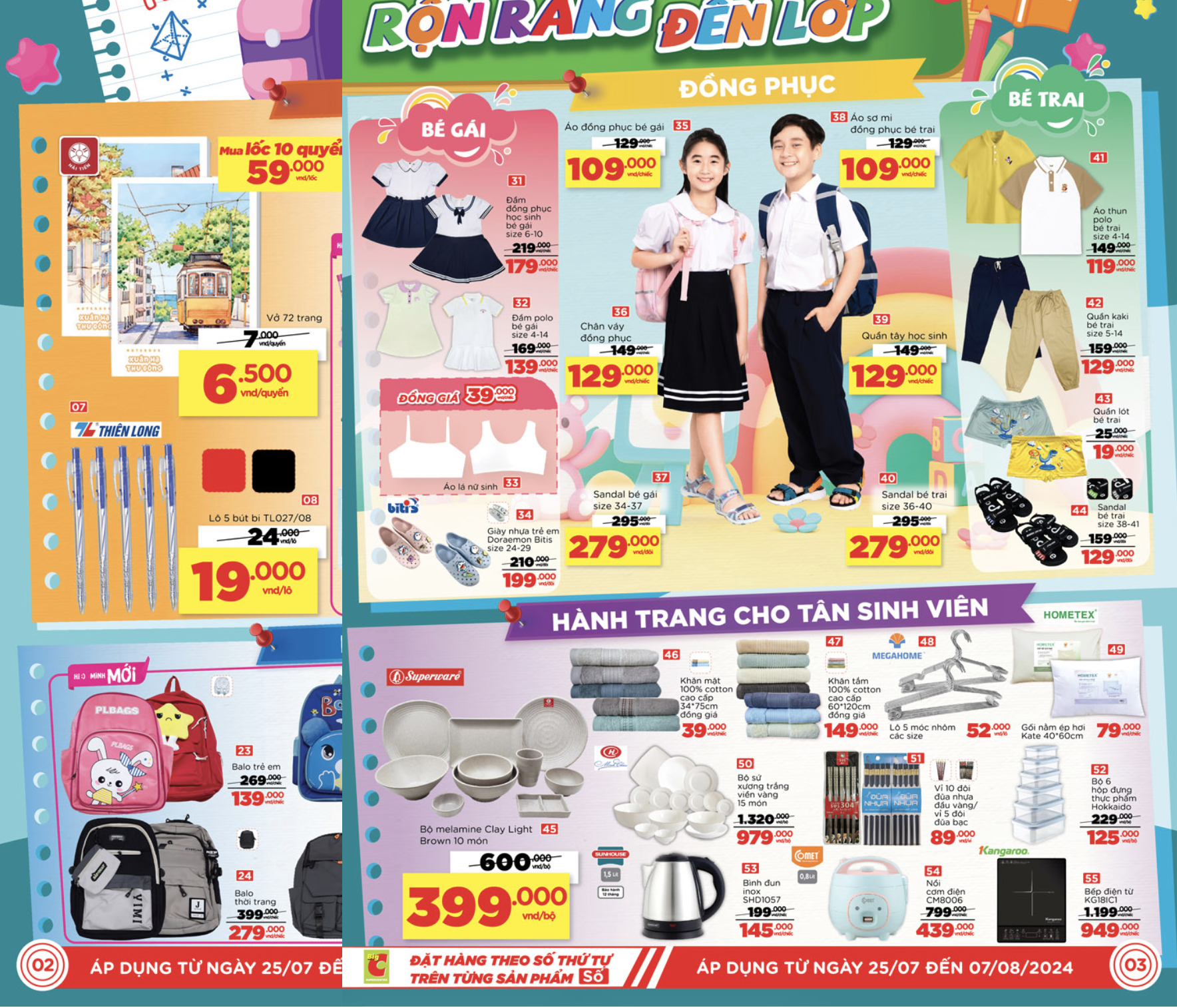 Tại hệ thống siêu thị GO!, Big C triển khai chương trình “Ưu đãi ngập tràn – Rộn ràng đến lớp”. Chương trình diễn ra từ nay tới hết ngày 7/8/2024, mang đến gần 1.000 sản phẩm dụng cụ học tập, đồng phục, ba lô, phụ kiện… với mức giảm giá mạnh, giúp các em học sinh, sinh viên yên tâm bước vào năm học mới.