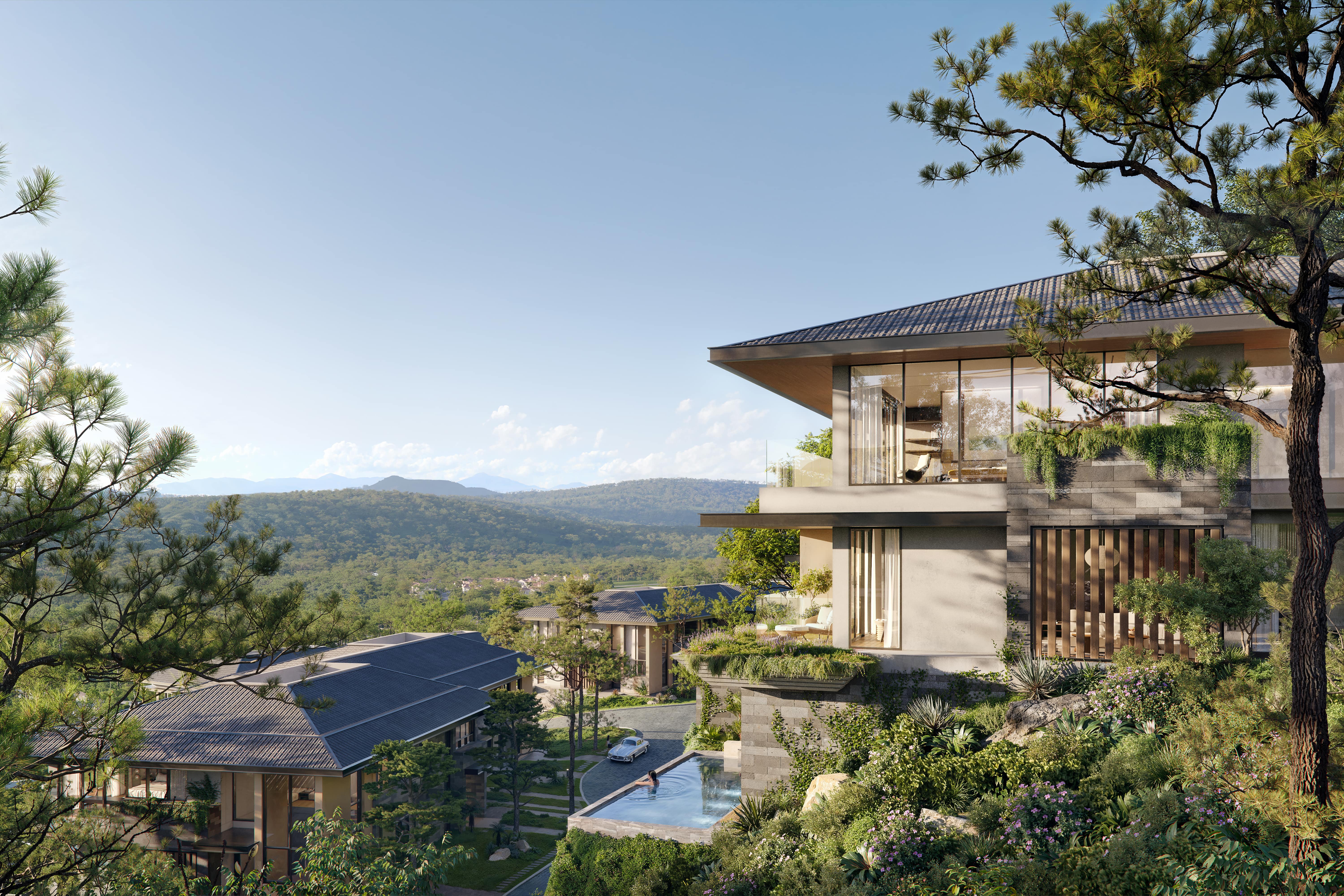 Phân khu Camellia Residences tọa lạc kiêu hãnh trên đồi thông cao tới 80m, hơn một bậc địa hình so với InterContinental Thanh Xuan Valley Resort.