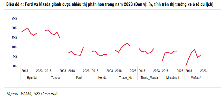 Ford và Mazda giành được nhiều thị phần hơn trong năm 2023 (Đơn vị: %, tính trên thị trường xe ô tô du lịch)