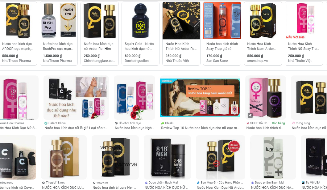 Đáng chú ý, có rất nhiều cơ sở quảng cáo nước hoa kích dục với nhiều tác dụng kỳ diệu như: “nước hoa có công dụng kích thích tình dục, cải thiện được thời gian quan hệ, tạo được sự sung mãn cũng như là cảm giác mới lạ khi yêu. Sản phẩm này rất phù hợp với các anh chàng đang FA lâu năm, hoặc đang trong thời gian cưa cẩm bạn gái, hay các cặp vợ chồng đang gặp vấn đề trong chuyện giường chiếu...”. Và đương nhiên, những quảng cáo kiểu này thu hút được rất nhiều sự quan tâm của cộng đồng mạng, có nhiều người bình luận và sẵn sàng để lại cả số điện thoại của mình nhằm được người bán hàng gọi lại tư vấn.