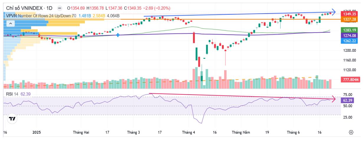 Bên cạnh đó, dù chỉ số Vn-Index đã vượt đỉnh nhưng có rất ít nhóm cổ phiếu theo kịp đà tăng của chỉ số, ngoại trừ: Thủy sản, Ngân hàng, Bất động sản, … Một số nhóm cổ phiếu vẫn còn cách đỉnh như Vingroup (-10,7%), Logistics (-7,9%), Chứng khoán (-4,2%), … Như vậy về mặt kỹ thuật, thị trường đang tạo sự phân kỳ về mặt kỹ thuật.