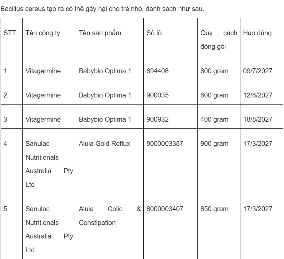 Cục An toàn thực phẩm cho biết, ngày 26/01/2026, theo thông tin cảnh báo của Cơ quan an toàn thực phẩm Hồng Kông (CFS) và thông tin cảnh báo của Cơ quan tiêu chuẩn thực phẩm Australia New Zealand (FSANZ) về việc thu hồi một số sản phẩm do nghi nhiễm độc tố cereulide, một độc tố do vi khuẩn Bacillus cereus tạo ra có thể gây hại cho trẻ nhỏ.