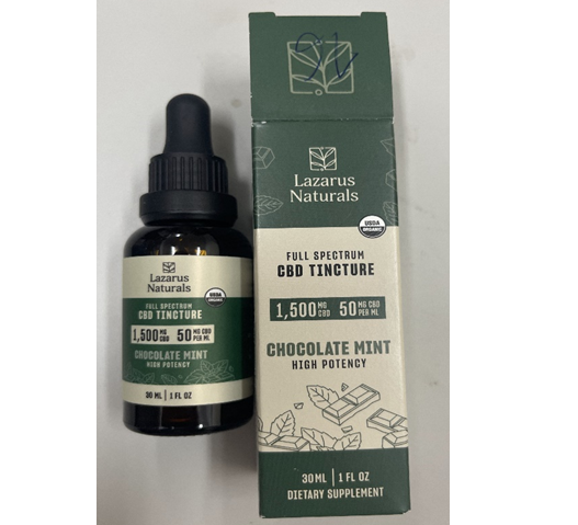 Mẫu dung dịch màu nâu bên trong chai thủy tinh màu nâu có nắp nhựa màu đen có nhãn hiệu “Lazarus Naturals Full Spectrum CBD TINCTURE 1500mg CBD 50 mg CBD per ml” đựng hộp giấy hình chữ nhật trên hộp có nhãn hiệu “Lazarus Naturals Full Spectrum CBD TINCTURE 1500mg CBD 50 mg CBD per ml” loại 30ml có ma túy loại Delta-9-tetrahydrocanabinol, thể tích: 30ml.
