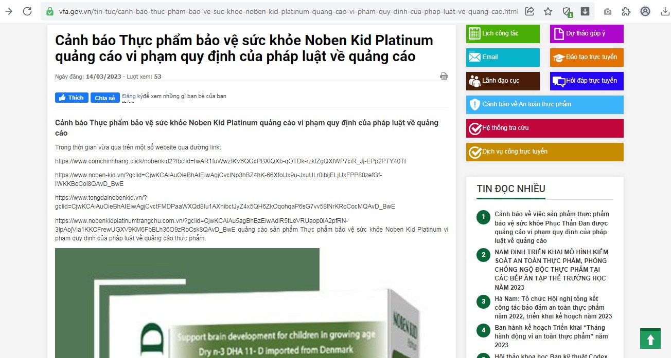 Ngày 14/3, Cục An toàn thực phẩm (Bộ Y tế) đã phát đi cảnh báo về sản phẩm thực phẩm bảo vệ sức khỏe Noben Kid Platinum vi phạm quy định về quảng cáo.